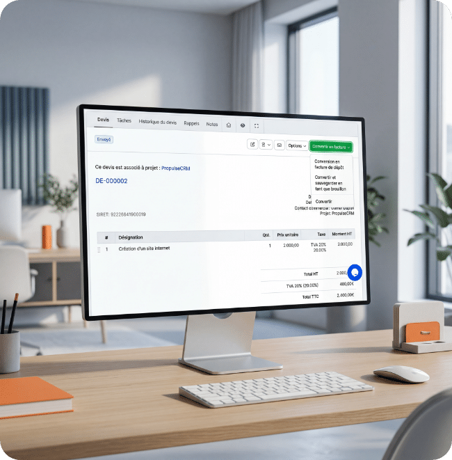Créez, envoyez et suivez vos devis et factures en quelques clics avec PropulseCRM. Un module de facturation intégré conçu pour les freelances, indépendants et petites entreprises qui veulent gagner du temps et rester conformes.