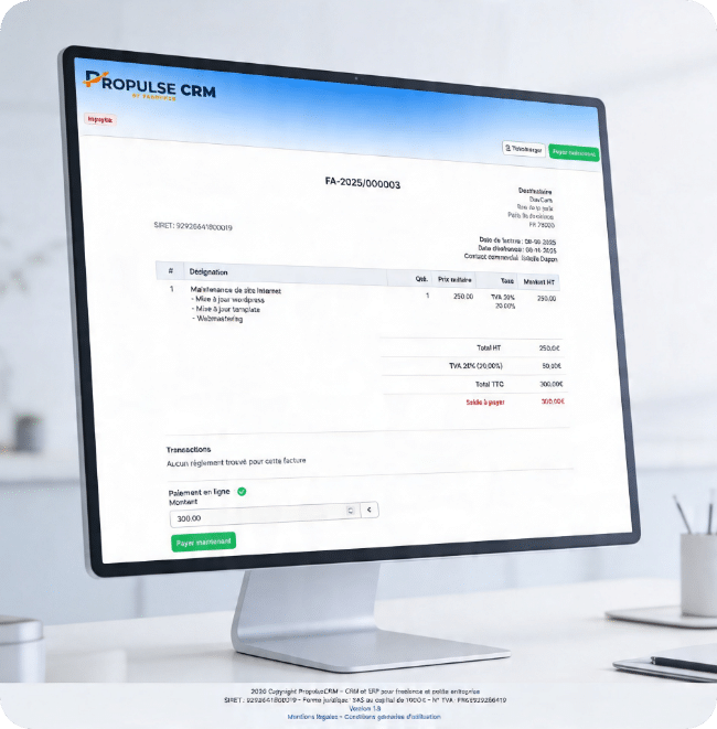 Oui, PropulseCRM génère des factures 100% conformes à la réglementation française : numérotation séquentielle automatique, mentions légales obligatoires (SIRET, TVA, conditions de paiement), calcul automatique de la TVA et archivage sécurisé. Le logiciel s’adapte à votre statut, que vous soyez en microentreprise ou au régime réel.